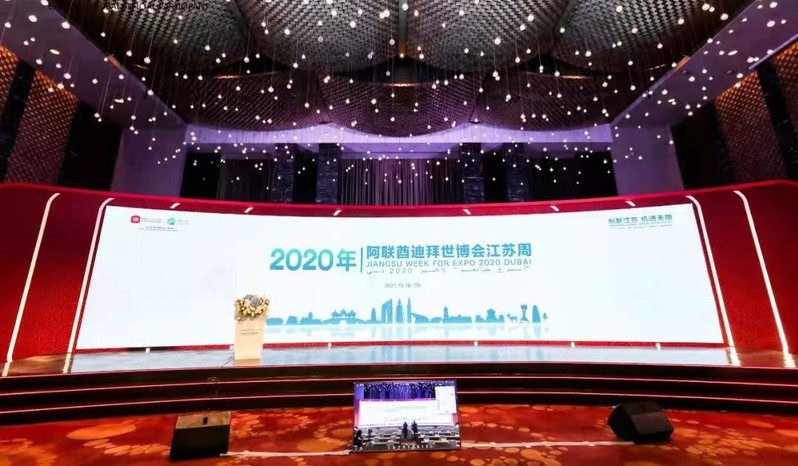 江苏省人民政府副省长惠建林现场致辞,阿联酋阿布扎比执行委员会委员、市政和交通部主席法拉赫,中国驻迪拜总领事馆总领事李旭航,阿联酋驻上海总领事馆总领事穆哈纳德·纳克比、迪拜世博会中国馆政府总代表、中国贸促会副会长张慎峰等分别视频致辞。