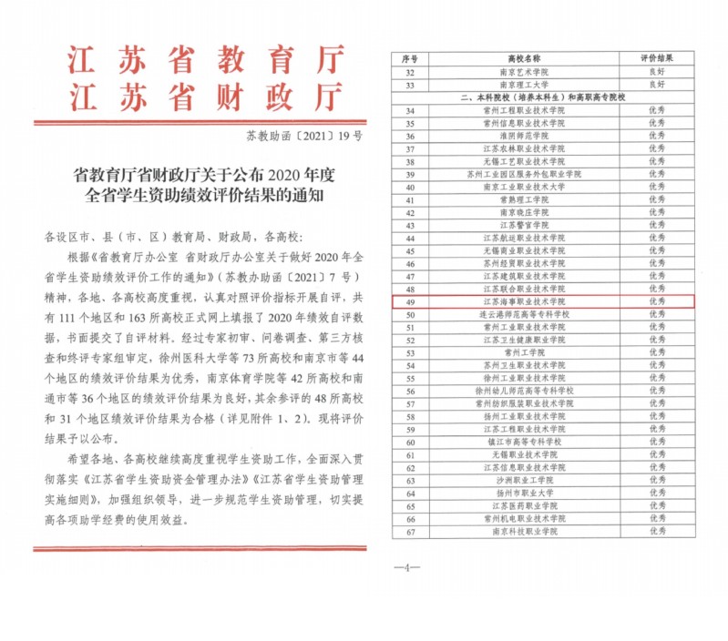 近日,江苏省教育厅、财政厅联合印发了《关于公布2020年度全省学生资助绩效评价结果的通知》(苏教助函〔2021〕19号),我校获得2020年度全省学生资助绩效评价“优秀”等级。