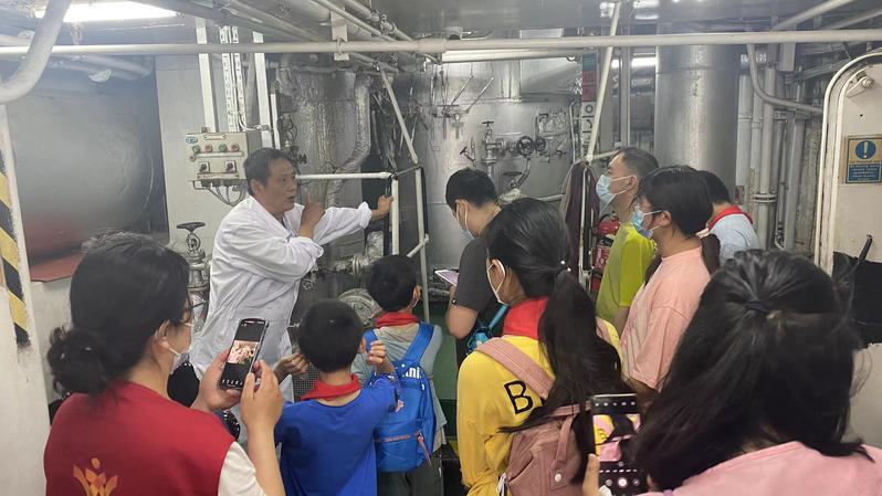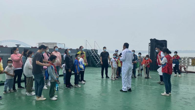 当天上午,15名小学生在家人和社区志愿者的陪伴下排着队来到了码头,刚进入栈桥就被一艘庞大的海船“育新”轮所震惊和吸引。工作人员热情地接待了学生和家长,向大家讲解了安全注意事项并带领他们登上了“育新”轮。小学生们以少年航海家的身份分组参观了船舶舱盖、船头、驾驶台、机舱、船员生活区,了解船舶仪器和船员生活环境,亲身感受船舶行驶时劈波斩浪的气势,感受航海家的培养和成长历程。参观过程中,工作人员不断和同学及家长们互动交流,讲解船上的设施装备、自身的航运经历及海洋强国的重要性,并告诉小学生们一定要爱护海洋,增强蓝色国土意识,关心航海事业。整个参观过程中小学生们既兴奋又激动,大家纷纷表示,这次的参观收获非常大,是一次很难忘的经历。