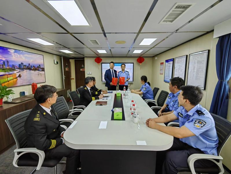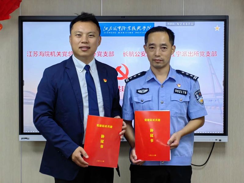 在实船实训基地“育新”轮会议室,校警双方举行了党建结对共建签约仪式。校机关党总支党政办党支部委员、板桥校区管委会办公室负责人朱孔阳对长航公安南京分局江宁派出所干警们一行表示热烈欢迎,并对他们近几年来给予实船实训基地船岸建设工作的支持表达了感谢。他简单回顾了今年两家单位联合开展的主题党日活动、水上消防技能培训、业务交流等校警合作项目,并表示两家单位在前期友好往来合作中收到了良好效果,在此基础上期待通过党建结对共建,实现党的建设与业务发展良性互动,从而达到“提升能力、促进和谐、维护安全、共同发展”的合作目标。