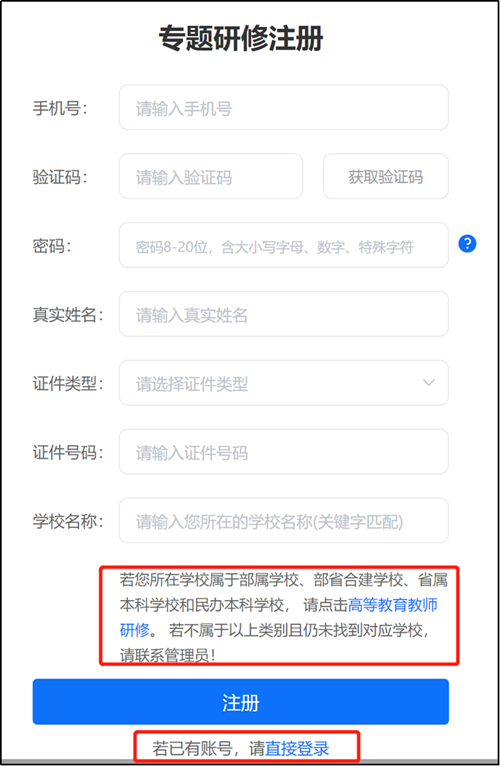 注:1.填写学校信息时,请输入关键字匹配学校选择,若您所在学校属于部属学校、部省合建学校、省属本科学校和民办本科学校,请进入高等教育寒假教师研修学习,若不属于以上类别,仍未找到对应学校,请联系管理员!