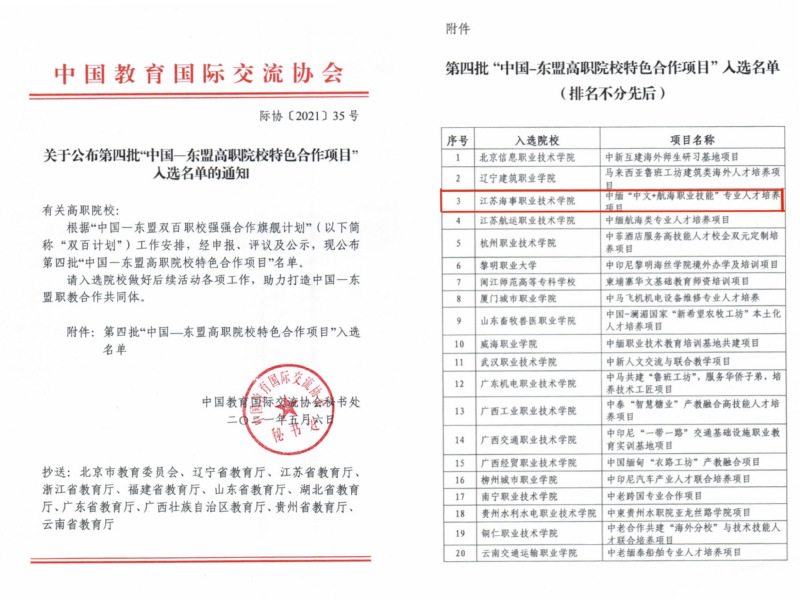 近日,中国教育国际交流协会公布了第四批“中国-东盟高职院校特色合作项目”入选名单,我校中缅“中文+航海职业技能”专业人才培养项目顺利入选。该项目积极探索产教融合与“一带一路”倡议对接,探索“中文+航海职业技能”人才培养模式,扩大和提升中国航海类职教影响力。