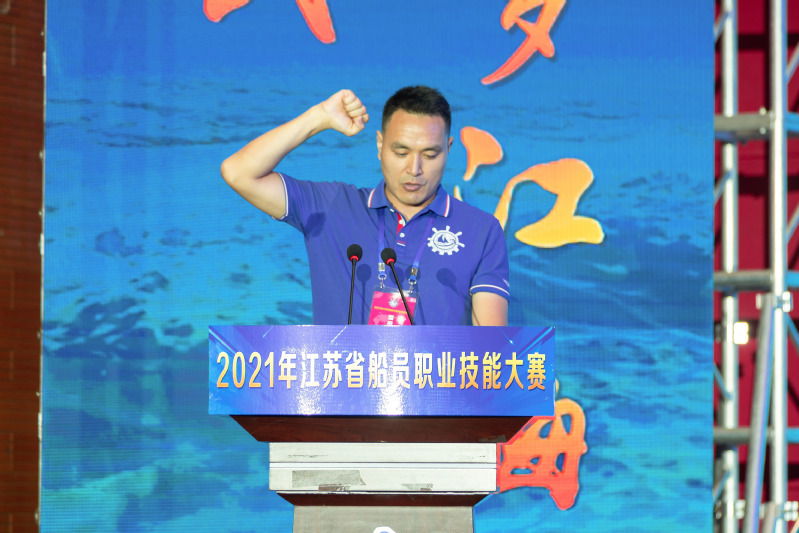 江苏远洋运输股份有限公司轮机长端礼聪、上海海事局时冬升分别代表参赛选手、裁判员在开幕式上宣誓。