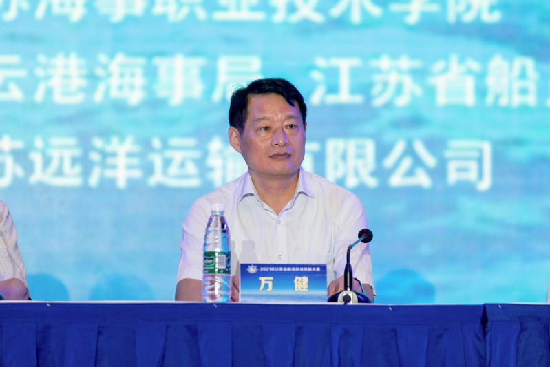 万健致辞。他首先代表江苏海事职业技术学院对各位专家和参赛选手的到来表示热烈的欢迎,向长期以来关心、支持和帮助学校事业发展的江苏海事局、江苏省教育厅、行业企业以及兄弟院校表示衷心的感谢。他说,江苏海事职业技术学院是新中国成立后建立的第一所专门培养远洋船员和内河船员的学校,是国家“双高计划”建设单位、全国优质专科高职院校、江苏省高水平高职院校建设单位。本届大赛由我校承办,是各级领导、专家、行业企业和各兄弟院校对我校的信任和鼓励,我们深感使命光荣、责任重大。学校党委、行政高度重视赛项承办工作,严格按照大赛组委会提出的“安全至上、公平公正、严格保密、协同推进”的十六字工作原则,努力把本届大赛办成“安全、公平、精彩、高效”的赛事典范。