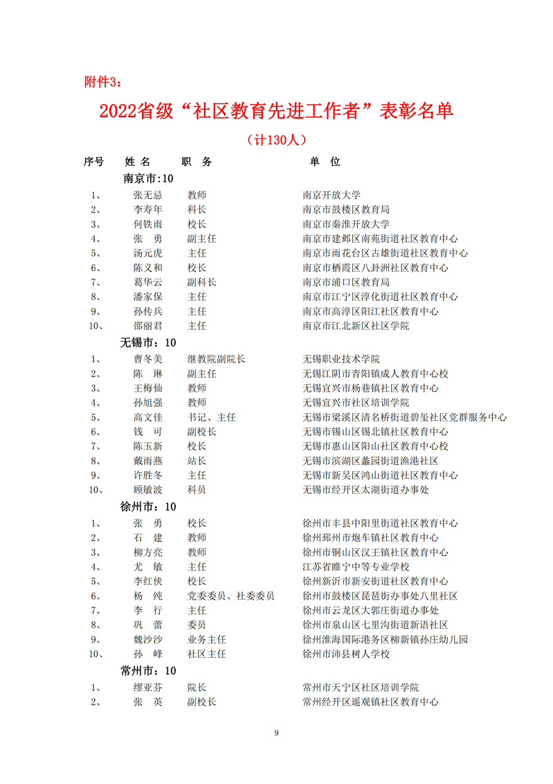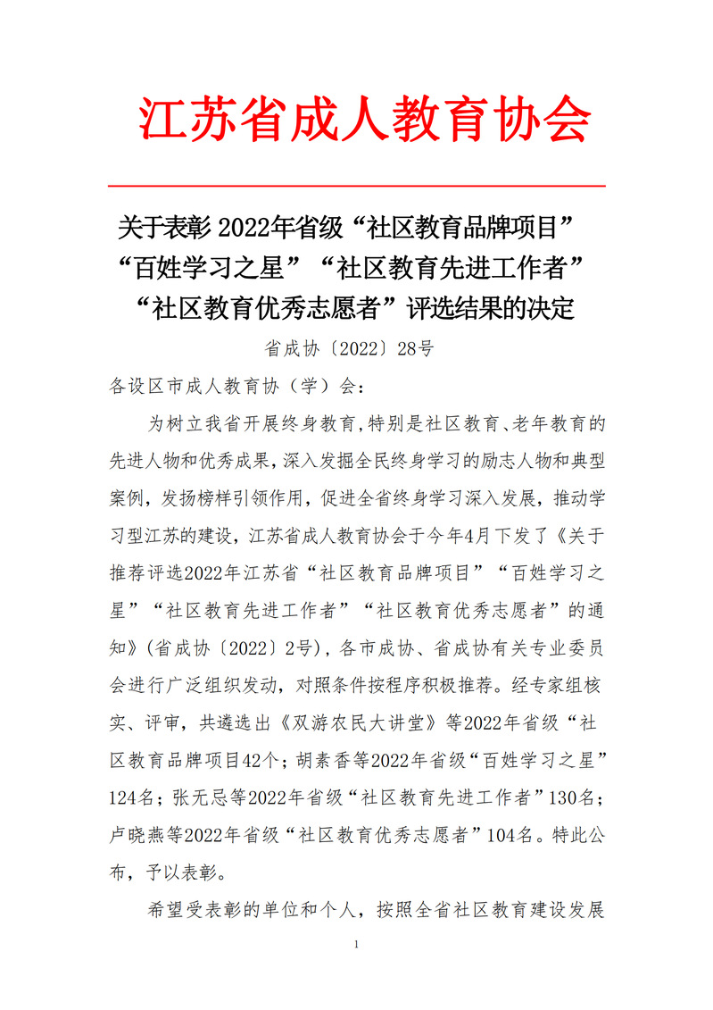 9月14日,江苏省成人教育协会发布《关于表彰2022年省级“社区教育品牌项目”“百姓学习之星”“社区教育先进工作者”“社区教育优秀志愿者”评选结果的决定》省成协〔2022〕28号,我校继续教育学院直属党支部副书记姚艳红被评为2022省级“社区教育先进工作者”(全省高校仅4人获此表彰)。