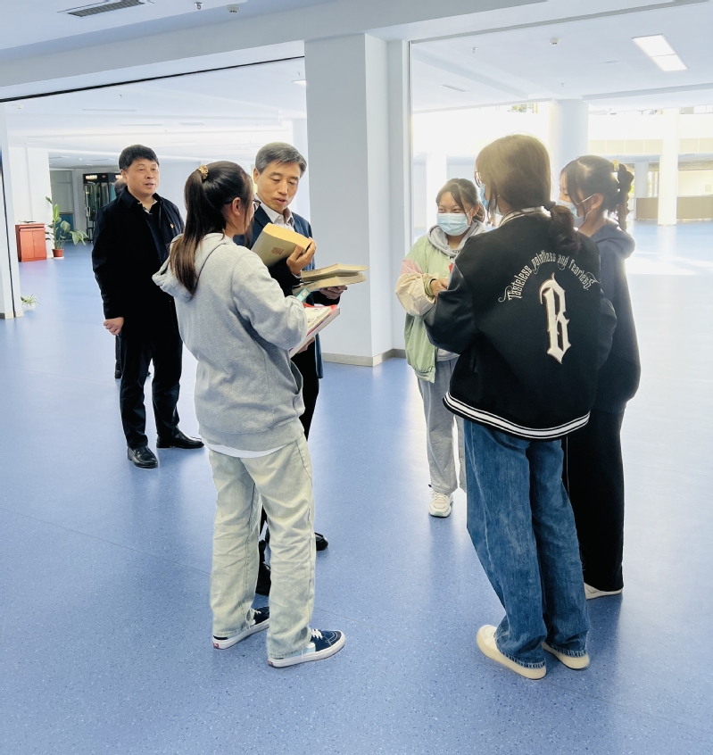 刘红明一行现场调研了图书馆自动借还机、朗读亭、大屏等的使用,并就自助借还机使用、归还等问题与老师、学生进行交流,对进馆数据统计的不及时性提出了整改意见。