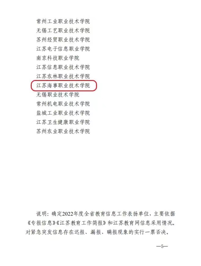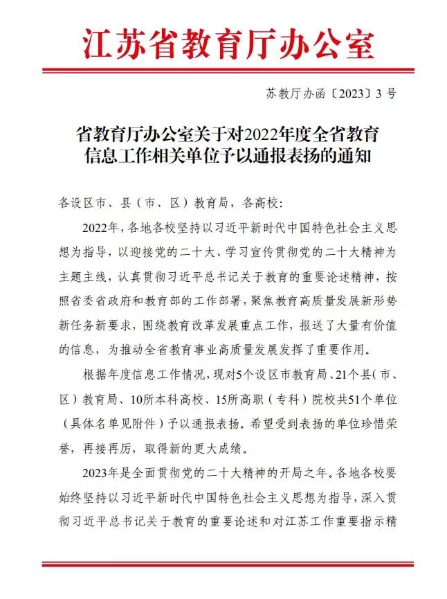 近日,江苏省教育厅发布2022年度全省教育信息工作情况通报,对10所本科高校、15所高职(专科)院校及5个设区市教育局、21个县(市、区)教育局予以通报表扬,我校名列其中。