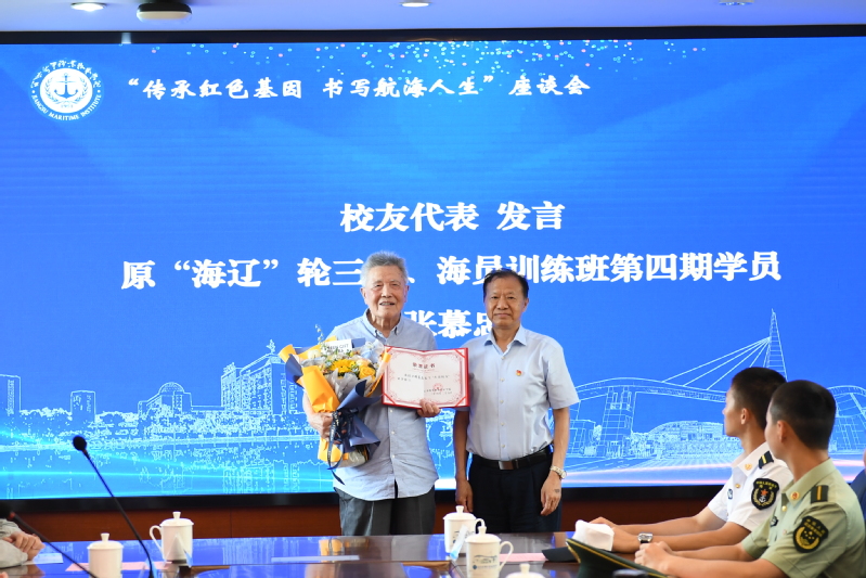 座谈会现场,95岁的“航海人”张慕忠老人以新中国第一艘升起五星红旗的海轮——“海辽”轮为切入点,讲述了他在“海辽”轮上的亲身经历以及参加海员训练班第四期学习的点滴往事。带领大家感悟中华人民共和国成立初期,航海事业“因水而生”的“红色血脉”的深厚历史底蕴,让我们更深刻感受到江苏海院血脉里奔腾的红色基因。会议期间,田乃清代表学校为张慕忠先生颁发了“杰出校友”证书并送上鲜花。