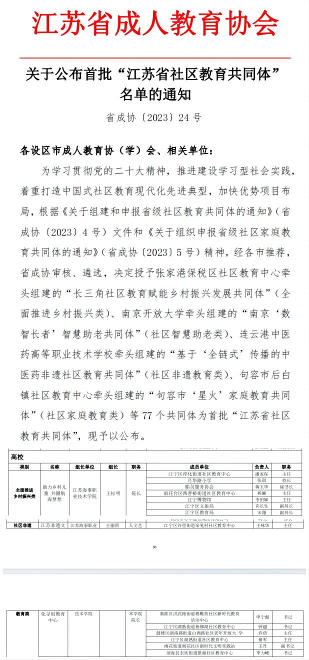近日,江苏省成人教育协会发布《关于公布首批“江苏省社区教育共同体”名单的通知》(省成协〔2023〕24号),我校继续教育学院王松明院长主持的“助力乡村儿童 共圆航海梦想”和人文艺术学院王丽莉院长主持的“江苏非遗文化寻创教育中心”两个项目成功获评首批“江苏省社区教育共同体”。