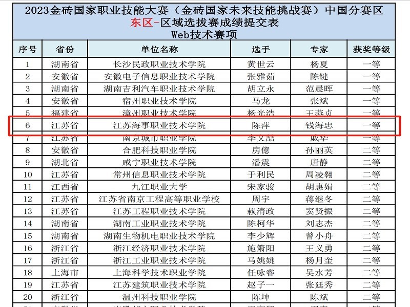 信息工程学院高度重视此项比赛,秉承“课赛融通”的教育理念,充分调动学生参赛积极性,配备专业的教师指导团队。由钱海忠博士指导人工智能211301班陈萍同学参加的2023金砖国家职业技能大赛Web技术赛项东区选拔赛以江苏省第一名的好成绩获得一等奖。