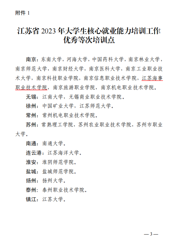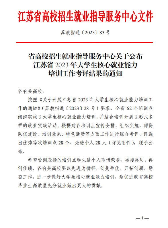 根据《省高校招生就业指导服务中心发布的关于江苏省2023年大学生核心就业能力培训工作考评结果的通知》(苏教指通〔2023〕83号),我校荣获“江苏省 2023 年大学生核心就业能力培训工作优秀等次培训点”荣誉称号。