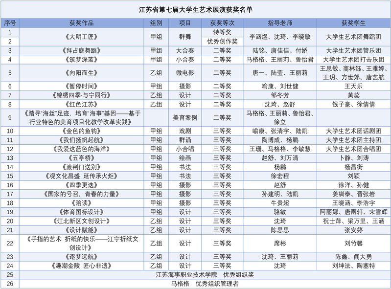 根据《教育部关于举办全国第七届大学生艺术展演活动的通知》(教体艺函〔2023〕3号)精神,省教育厅于2023年3月—11月开展了以“厚植家国情怀,涵养进取品格”为主题的江苏省第七届大学生艺术展演。经省教育厅组织专家评审,在近日公布的获奖名单中,我校在本届艺术展演中取得了优异成绩,并首获优秀组织奖。其中,舞蹈作品《大明工匠》喜获舞蹈甲组特等奖,实现我校大艺展特等奖突破;器乐作品《拜占庭舞蹈》获大合奏甲组二等奖;器乐作品《筑梦深蓝》获小合奏甲组二等奖,此外还获得微电影乙组二等奖1项,摄影作品甲组二等奖1项,设计作品乙组二等奖2项,美育案例二等奖1项等,实现了我校历届参演成绩与获奖数量的突破。