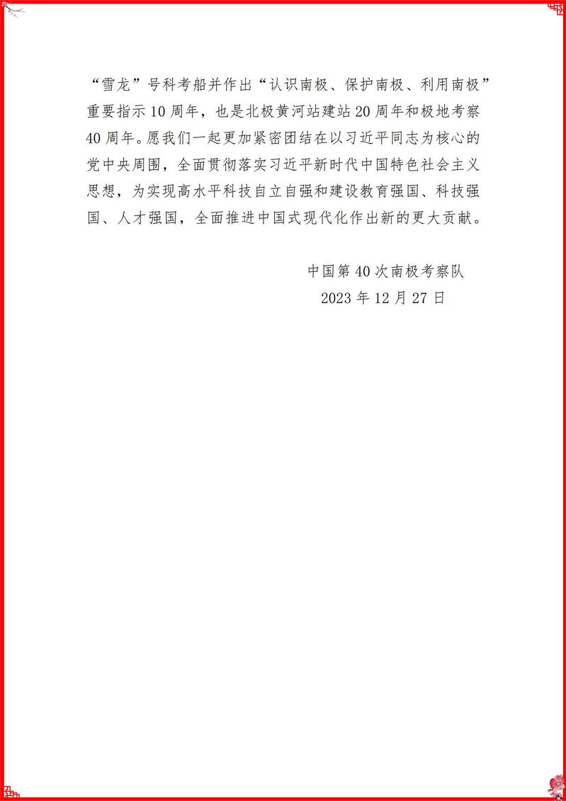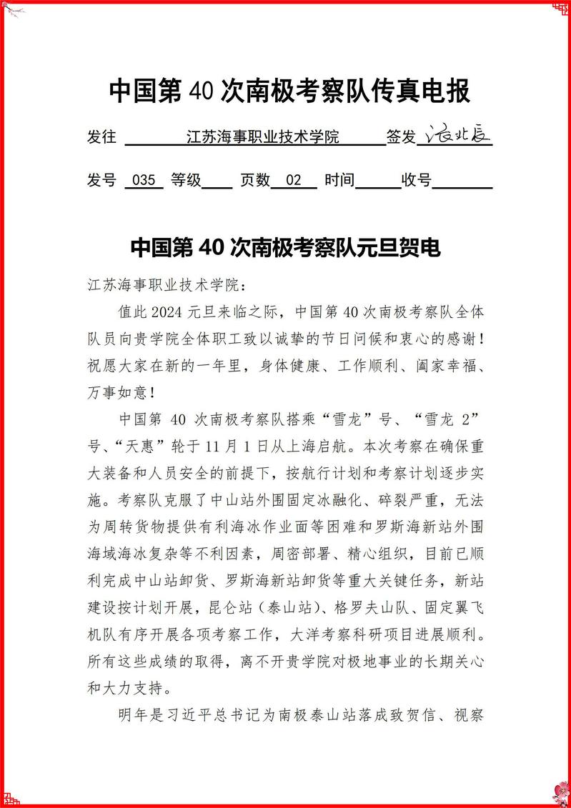 12月27日,中国第40次南极考察队以传真电报形式向我校全体员工发来2024年元旦贺电,向我校全体职工致以诚挚的节日问候和衷心的感谢。