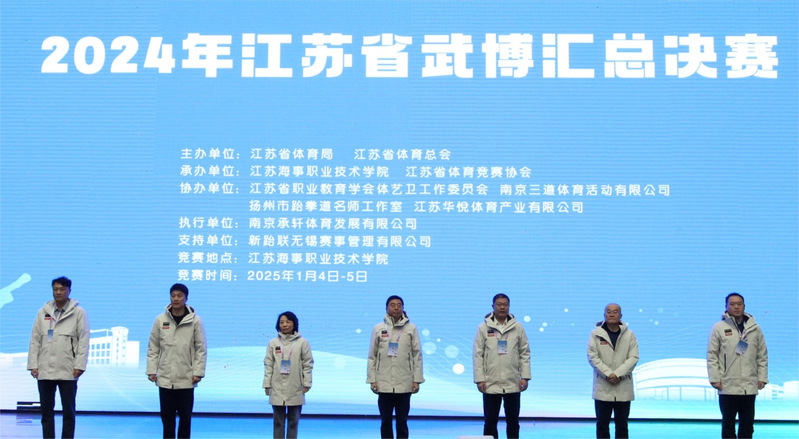1月4日上午9点,2024年江苏省武博汇总决赛在我校体育馆拉开帷幕。江苏省体育局二级巡视员、省体育总会副会长范金华、学校党委委员、副校长马洪涛,江苏省体育总会副秘书长徐志胜、学校体育部主任陈军,江苏省体育竞赛协会秘书长唐建等同志共同出席了开幕式。全省42支代表队近600名运动员参加了本次赛事。比赛由江苏省体育局和江苏省体育总会联合主办,我校和江苏省体育竞赛协会共同承办。