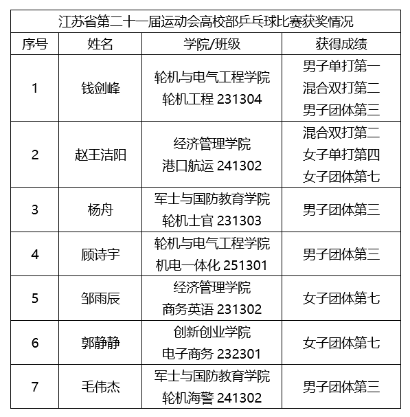 11月5日,江苏省第二十一届运动会高校部乒乓球比赛在南京信息工程大学圆满闭幕。来自全省48支高职院校代表队展开了激烈且精彩的角逐。我校乒乓球运动员以凌厉的攻势与沉稳的战术在比赛中奋勇拼搏,最终荣获“一金一银一铜”团体总分前三的佳绩!