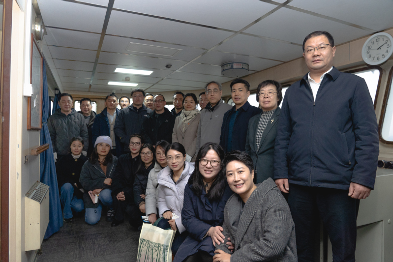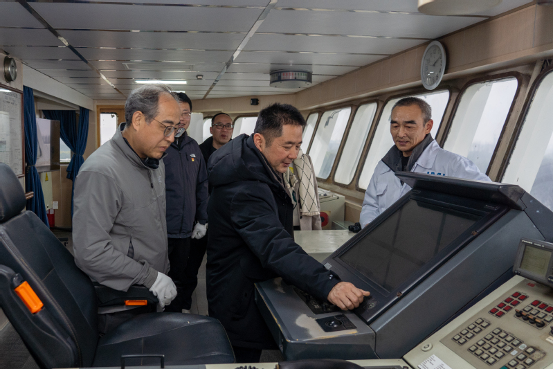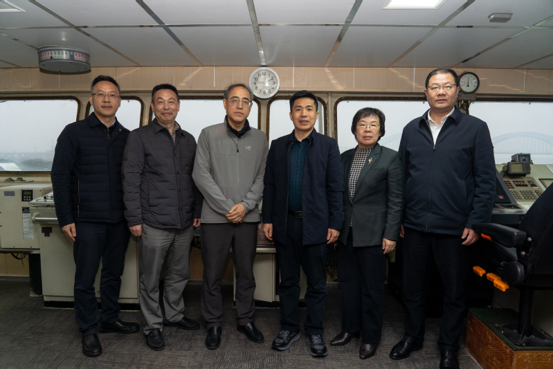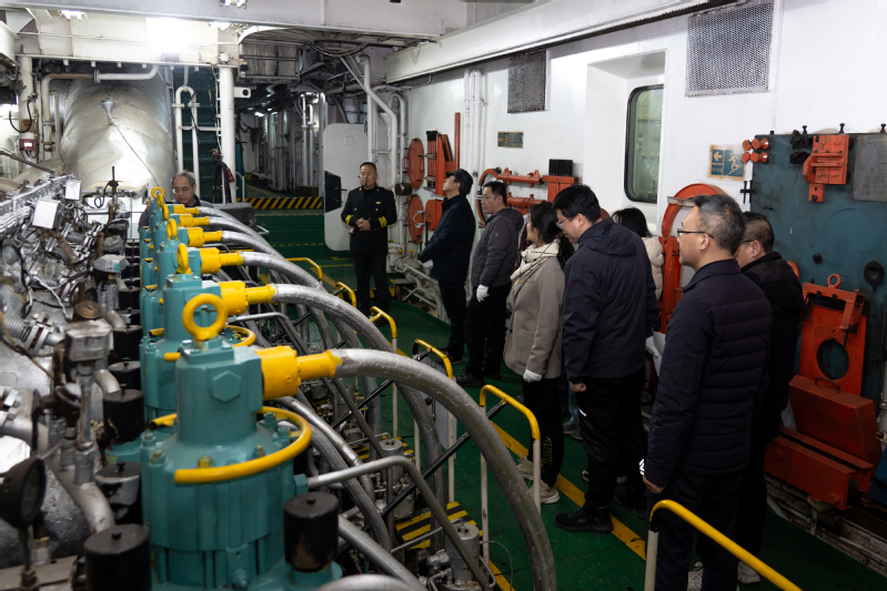 活动现场,与会人员共同登上停泊于大胜关大桥畔的我校“育新”轮实习船,沉浸式感受航海职业教育的实践特色。在浓厚的航海文化氛围中,大家实地观摩了船舶动力系统、电气系统、驾驶台与生活舱等区域,深入了解这艘集教学、实训、科研于一体的“海上课堂”的育人功能与建设成果。束悦在观摩中表示,深刻体会到学校深厚的办学底蕴与产教融合的实践成果,期待未来双方在党建引领下,将出版工作与职业教育改革深度融合,互学互鉴、同向发力。随后,全体人员在船舱会议室共同观看《向海而行》纪录片,进一步凝聚起深耕航海职业教育、服务海洋强国建设的共识与力量。