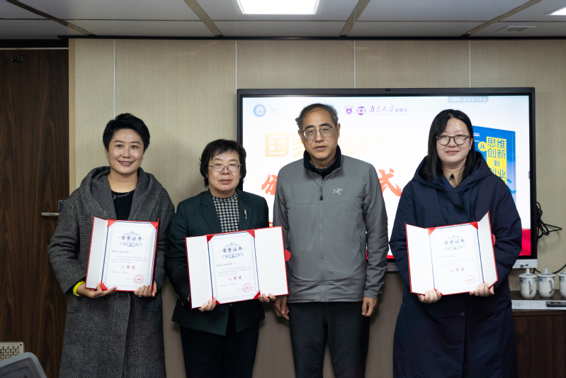 签约仪式现场还举行了第二届全国教材建设奖颁奖环节。由南京大学出版社出版、我校陈晓琴、王丽莉、陆莹主编的《从思维创新到创业实践》荣获该奖项,王文军为三位主编颁发获奖证书。