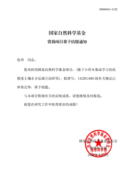 日前,我校收到国家自然科学基金委员会通知,我校船舶与智能制造学院张玲老师主持的国家自然科学青年基金项目《基于小样本集成学习的高精度土壤水分反演方法研究》(批准号:42201406)通过国家自然科学基金委员会审核,顺利如期结题。这是首个以我校为依托单位承接的国家自然科学基金结题项目,其顺利结题标志着我校科研工作的又一项重要突破。