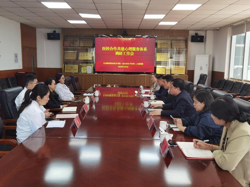 为加强在校学生心理健康服务体系建设,构建科学有效的心理危机预防与干预工作机制,4月8日上午,学校党委委员、副校长郑军带队赴南京市江宁区第二人民医院开展调研交流,学工处相关人员随同调研。江宁区第二人民医院院长张晓燕、副院长文璐、心理科主任肖华、心境障碍科主任张杰参加会谈。